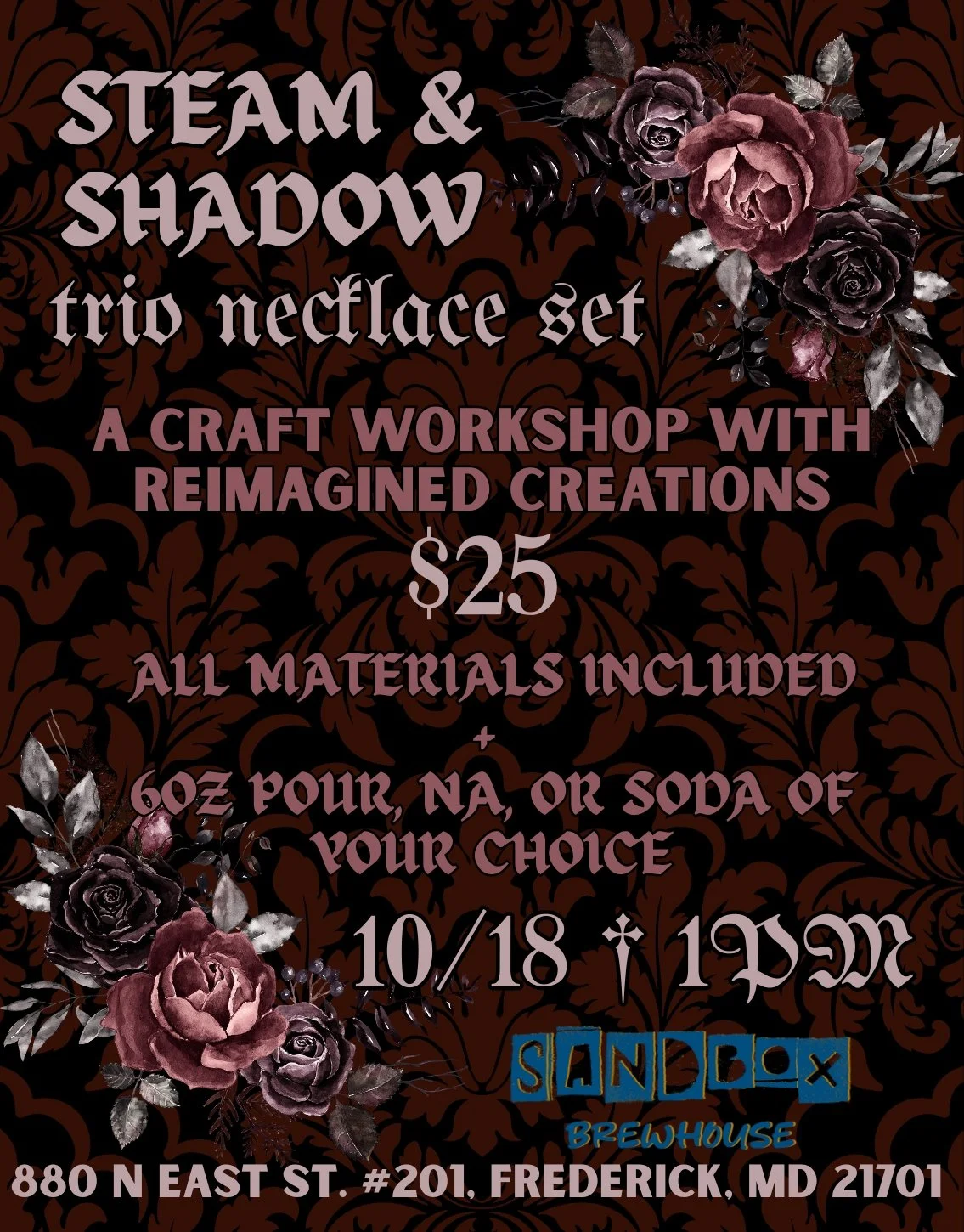 Your $25 ticket includes all materials needed, along with a 6oz pour, NA, or soft drink of your choice!