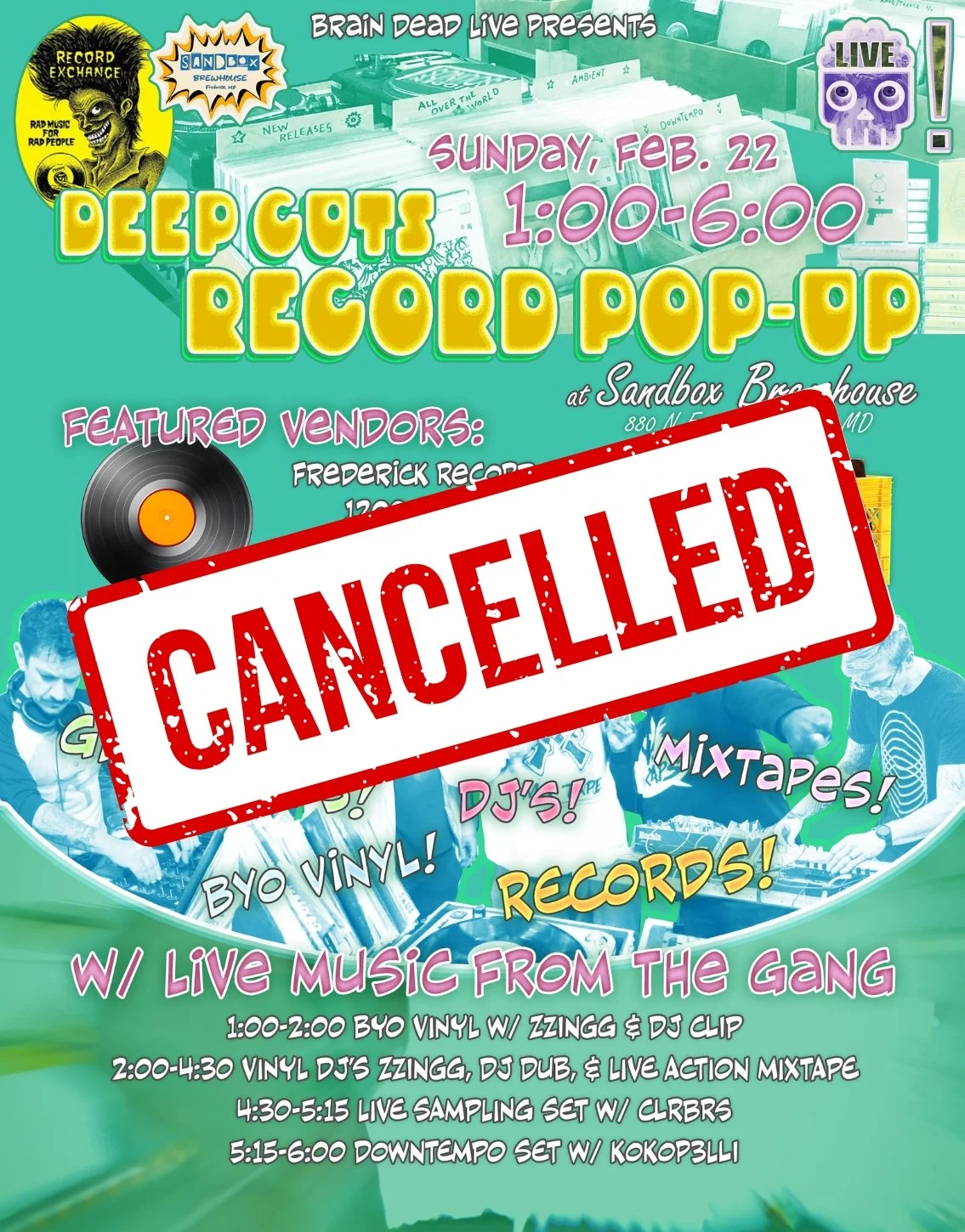 LIVE MUSIC SCHEDULE: 1-2 BYO Vinyl with Zzingg and DJ Clip 2-4:30 Live Action Mixtape, DJ Dub, Zzingg 4:30-5:15 CLRBS Live Sampling Set 5:15-6 Special Downtempo Set by Kokop3lli